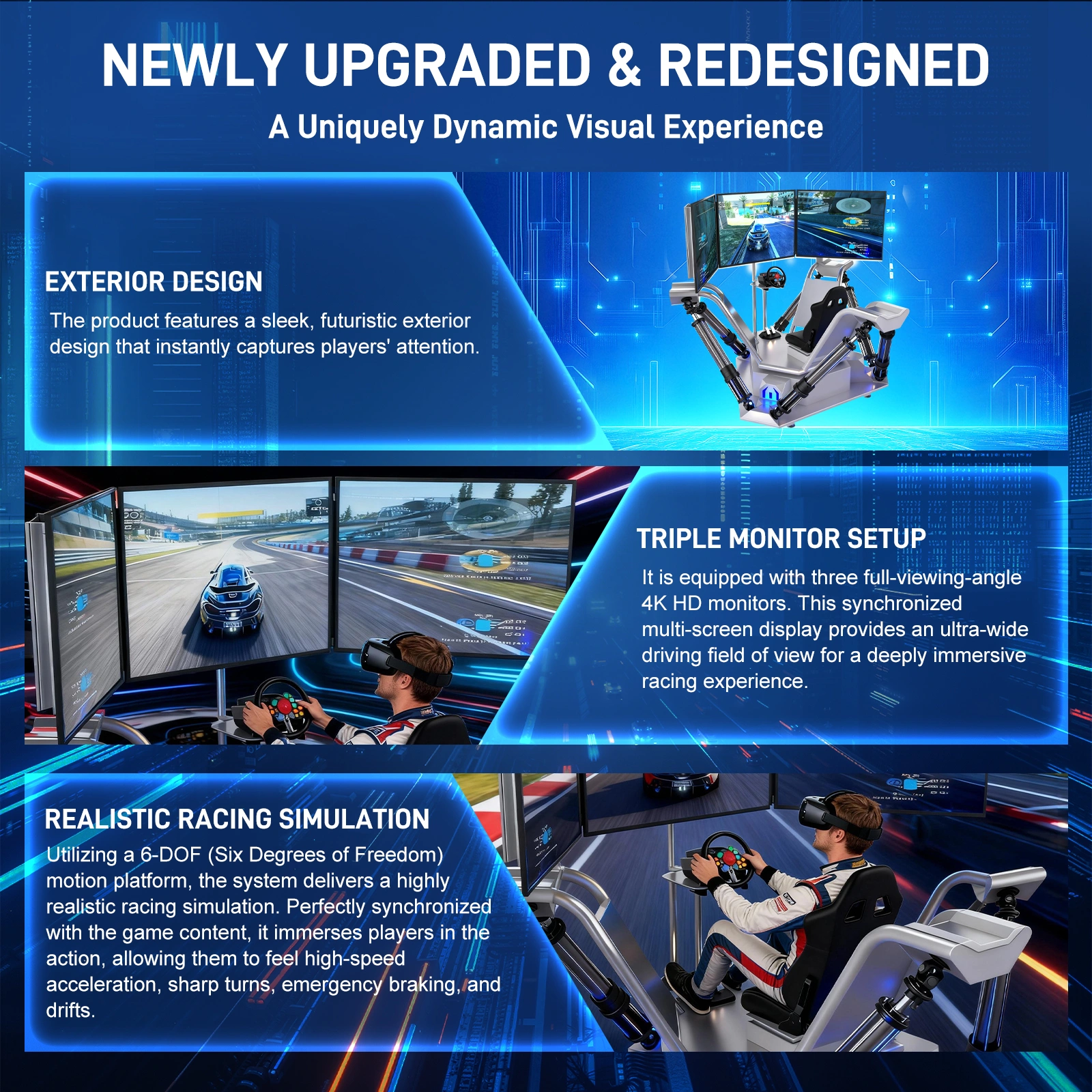 Introducing the industry’s premier dual-purpose simulation system: the Triple-Screen 6-DOF Racing & Safety Simulator. This state-of-the-art commercial platform masterfully combines the adrenaline of professional racing with the critical, life-saving lessons of impaired driving education. Featuring a professional triple-screen visual setup mounted on a powerful six-degree-of-freedom motion platform and integrated with optional VR technology, it delivers unmatched realism for entertainment centres, driving schools, corporate events, and public safety exhibitions.