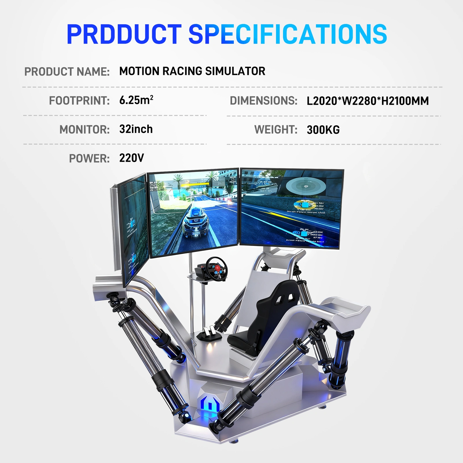Motion System: Industrial 6-DOF (Surge, Sway, Heave, Roll, Pitch, Yaw) platform.